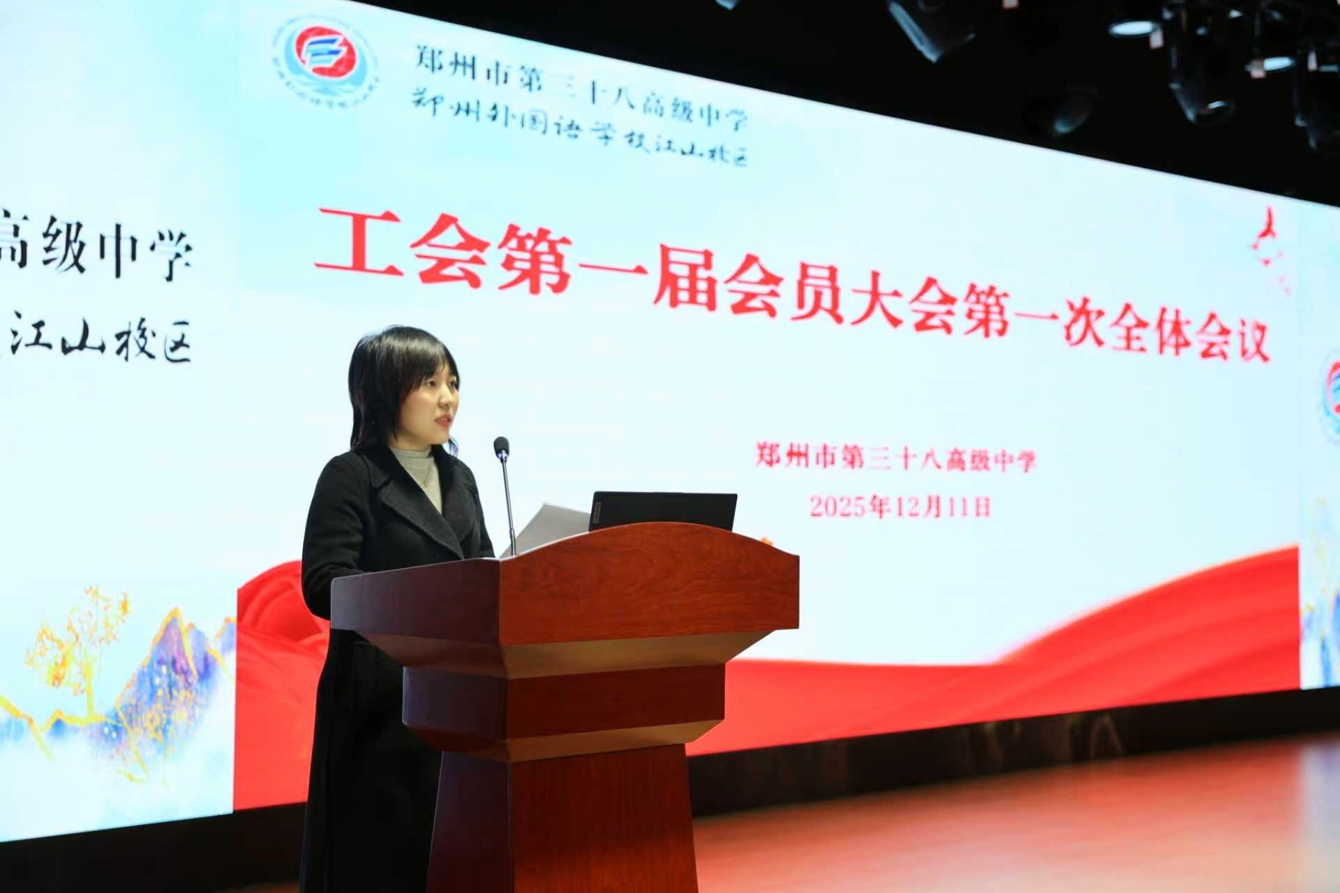 12月11日下午,郑州市第三十八高级中学第一届工会会员大会在学术报告厅成功召开。学校领导班子成员、全体工会会员齐聚一堂,共同见证了学校工会组织的正式成立。大会由工会筹备组成员张艳奎主持。