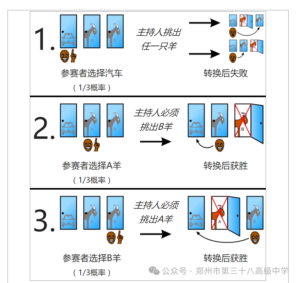 三扇门后藏一车两羊,选定一门后,主持人打开一扇有羊的门,换门还是不换门?