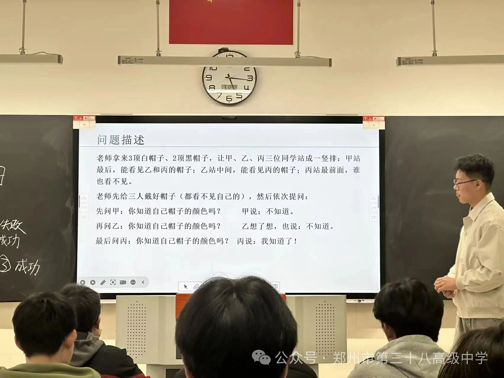 为深化校园数学文化氛围,提升学生的逻辑思维与决策能力,郑州市第三十八高级中学西格玛Σ社团于3月12日成功举办了“推理与策略”主题数学活动。课堂上,主讲人任星润老师带领大家拆解四大经典逻辑推理题,在思考与解惑中,让同学们沉浸式感受数学逻辑的独特魅力。