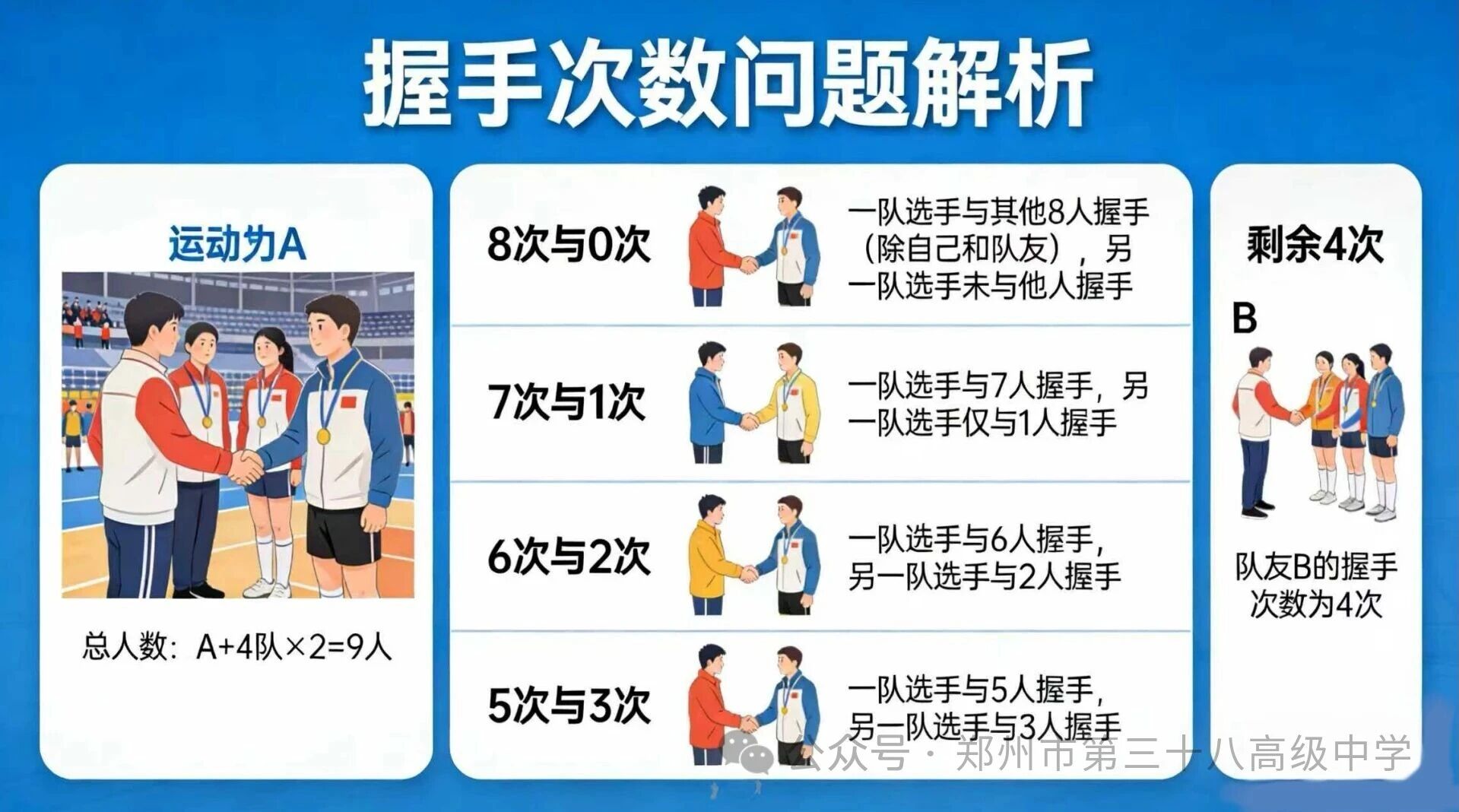 面对这一问题,主讲人通过配对分析的方法化繁为简,将握手次数两两对应:8次与0次、7次与1次、6次与2次、5次与3次各为一队,最后剩余的4次,便是队友B的握手次数,让同学们轻松掌握了这一解题技巧。