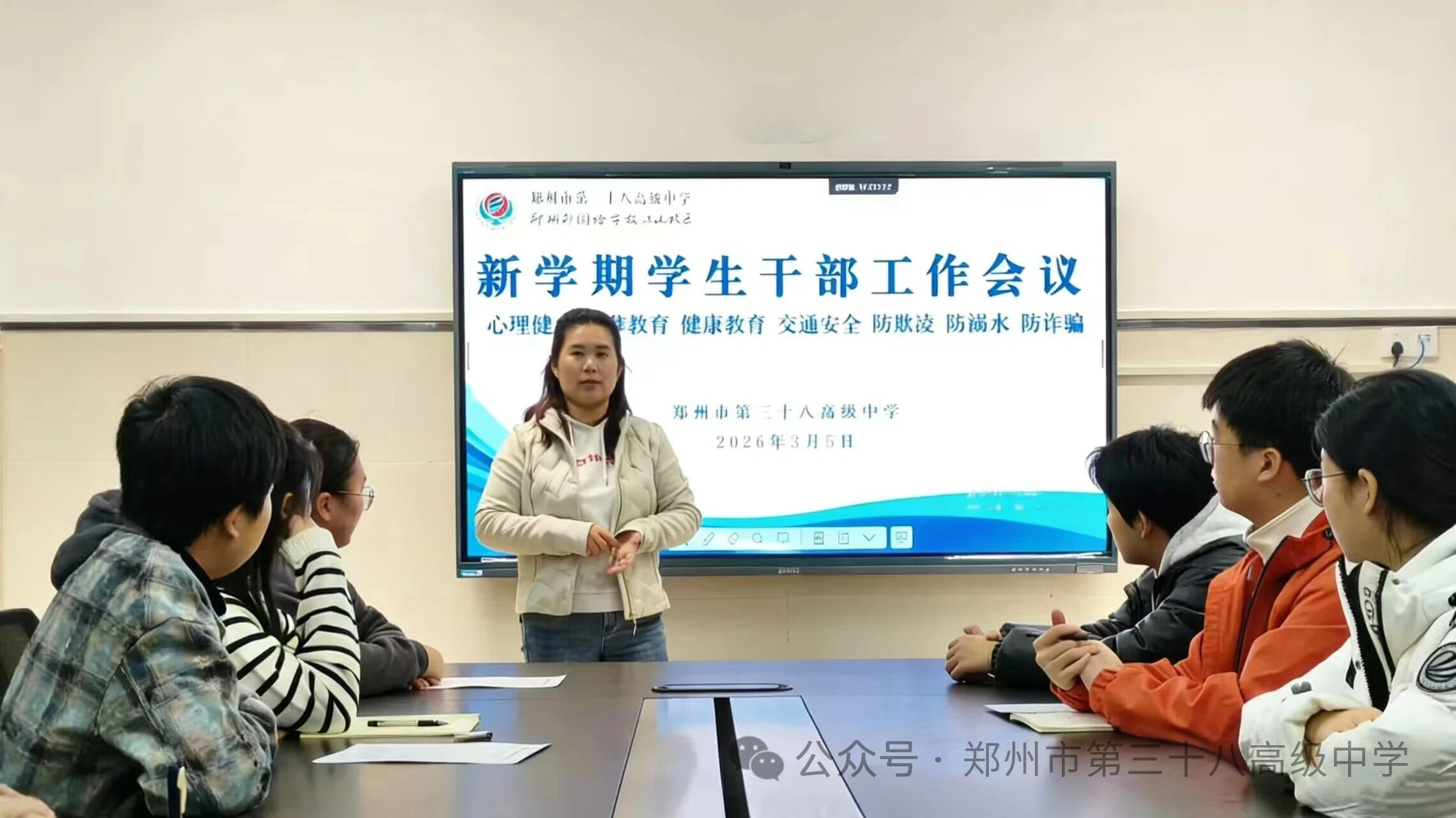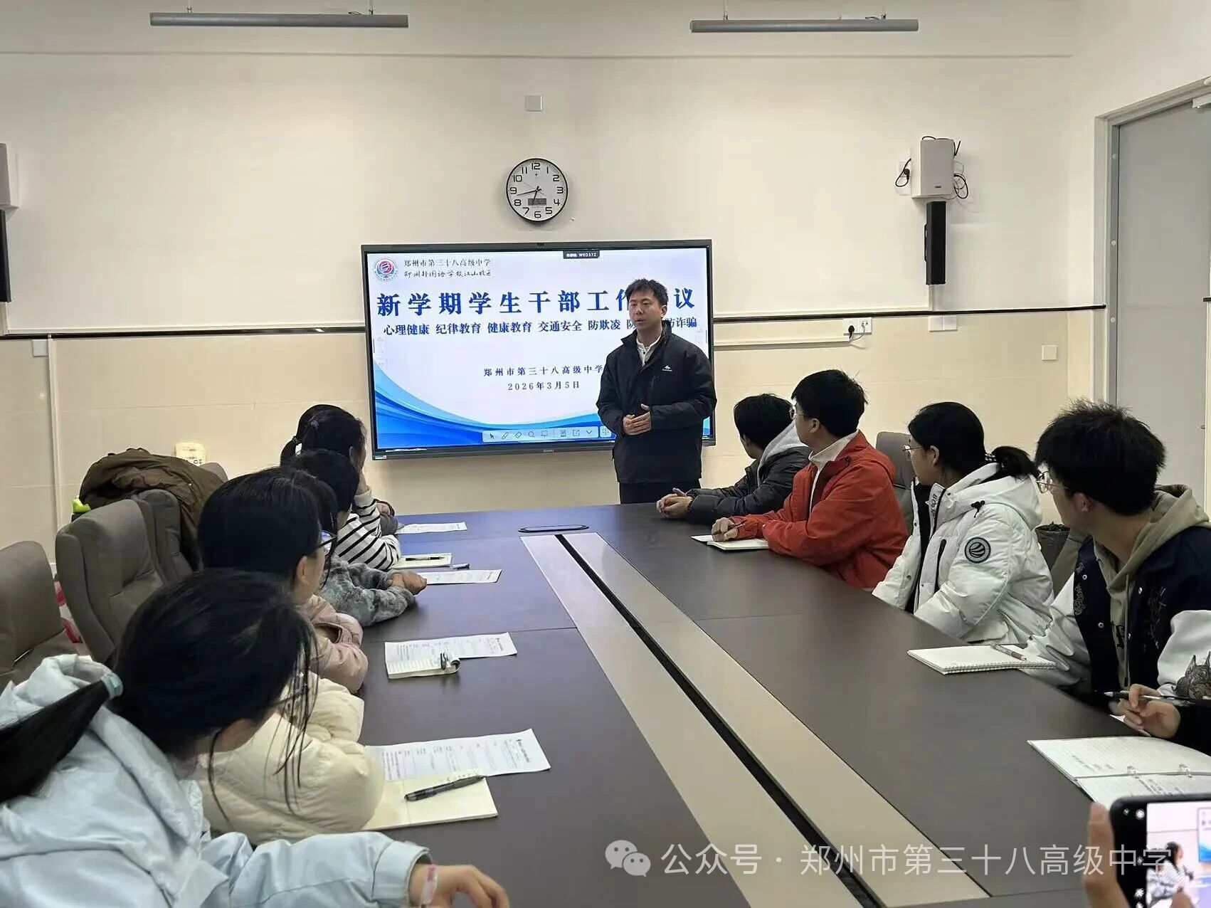为进一步提升学生干部的综合素养,筑牢校园安全与健康防线,3月5日下午,郑州市第三十八高级中学德育处组织召开了新学期学生干部工作会议。各班班长及心理委员参加了此次培训。