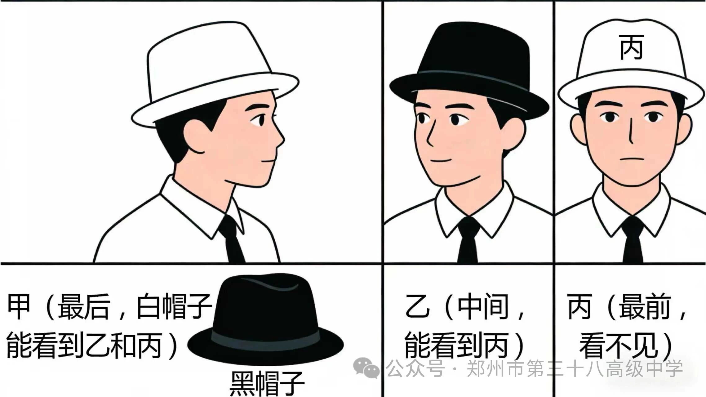 老师拿来3顶白帽子、2顶黑帽子,让甲、乙、丙三位同学站成一竖排:甲站最后,能看见乙和丙的帽子;乙站中间,能看见丙的帽子;丙站最前面,谁也看不见。