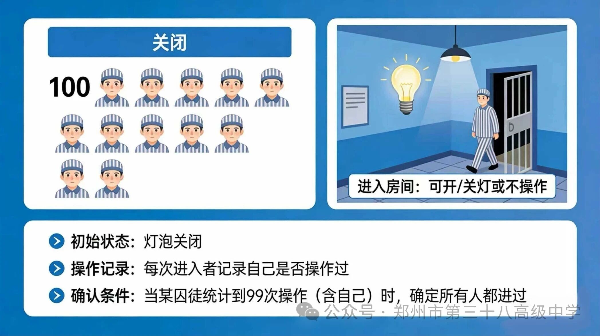 于是,老师带领大家共同学习了经典解题策略:选定一名计数员,其余囚徒仅在灯灭时开一次灯,计数员灯亮时关灯计数,待数到99即可确定全员入房。这一方法让同学们学会从复杂场景中提炼关键信息,构建清晰解题思路。