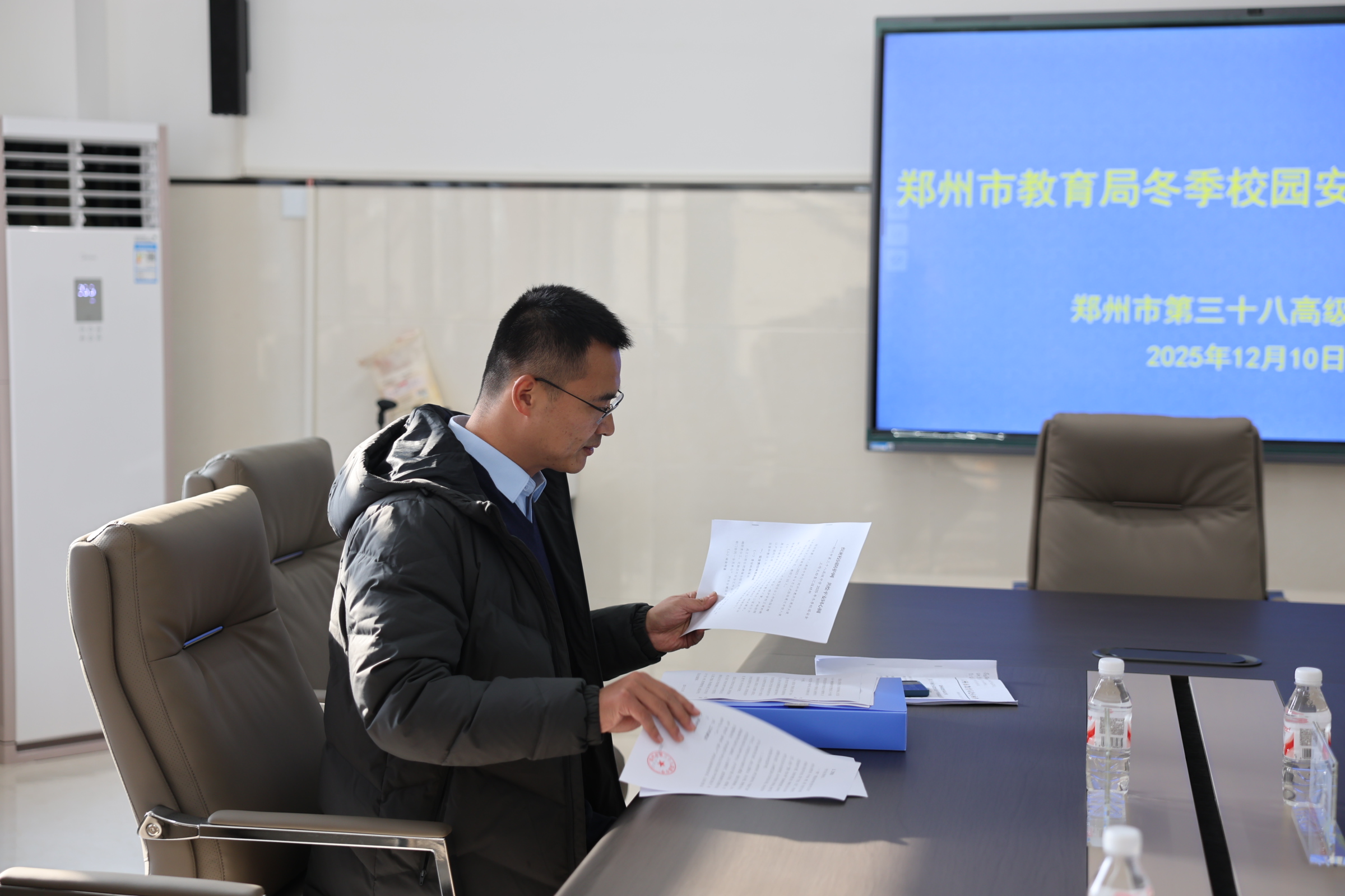 为全面落实郑州市教育局关于冬季安全工作的部署要求,切实保障师生生命财产安全,筑牢校园安全防线,营造平安有序的教育教学环境,12月10日下午,郑州市教育局冬季校园安全专项检查组在市教育局人事处处长李占国的带领下,通过查阅档案资料、实地参观走访、现场问询相结合的方式,对郑州市第三十八高级中学进行了全面细致的检查与指导。