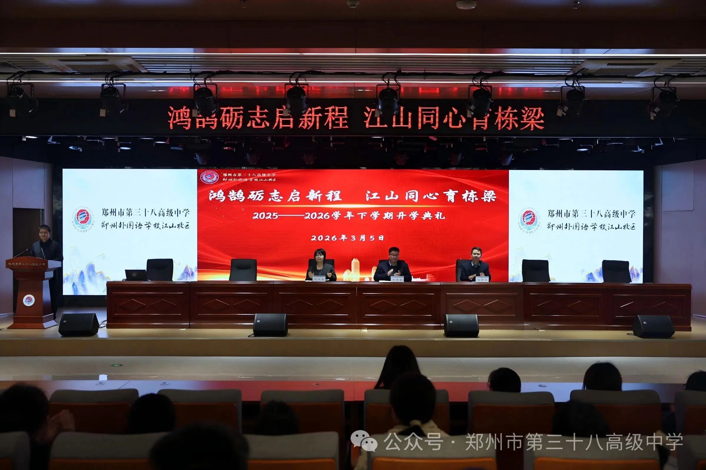 东风洒雨露,春归满校园。3月5日,郑州市第三十八高级中学2025—2026学年下学期开学典礼于学术报告厅隆重举行。典礼以“鸿鹄砺志启新程,江山同心育栋梁”为主题,在庄严的国歌声中拉开帷幕。