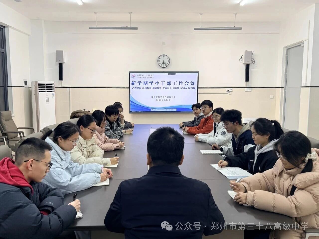 为进一步提升学生干部的综合素养,筑牢校园安全与健康防线,3月5日下午,郑州市第三十八高级中学德育处组织召开了新学期学生干部工作会议。各班班长及心理委员参加了此次培训。