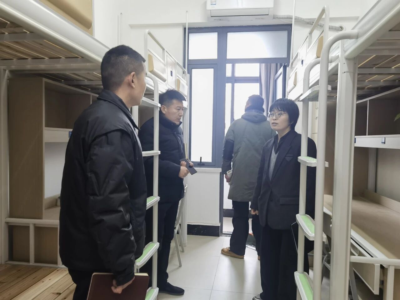 宿舍区,检查小组全面查看门窗锁具、水电设施及灭火器等消防设备,要求管理人员加强假期巡查,保障宿舍安全。